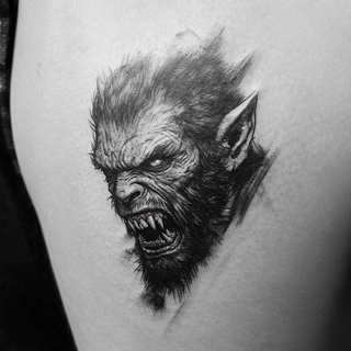 The 'Horror Werewolf Bite' tattoo design encapsulates the raw, primal nature of transformation and the duality of human existence, merging elements of horror with a visceral artistry that evokes fear and fascination. This captivating design features a striking depiction of a werewolf’s fanged maw, intricately woven with blood-red accents and intricate, swirling patterns that mimic the wild, untamed ferocity of the creature. Surrounding the bite mark, delicate filigree of thorny vines intertwines, symbolizing the entrapment of inner demons and the struggle between humanity and bestial instincts. Emotionally, this tattoo evokes a sense of tension between beauty and terror, portraying not just the pain of being marked but also the power that comes with embracing one's